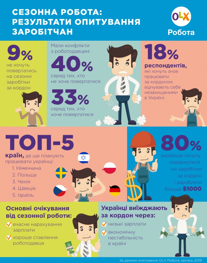 “41% сезонних заробітчан, які готові повернутися за кордон, турбуються про зарплату, для 36% має значення хороше ставлення роботодавця. Також для них більше значення має офіційне працевлаштування – 25% та безпечні умови праці – майже 20%”, – свідчать результати опитування.