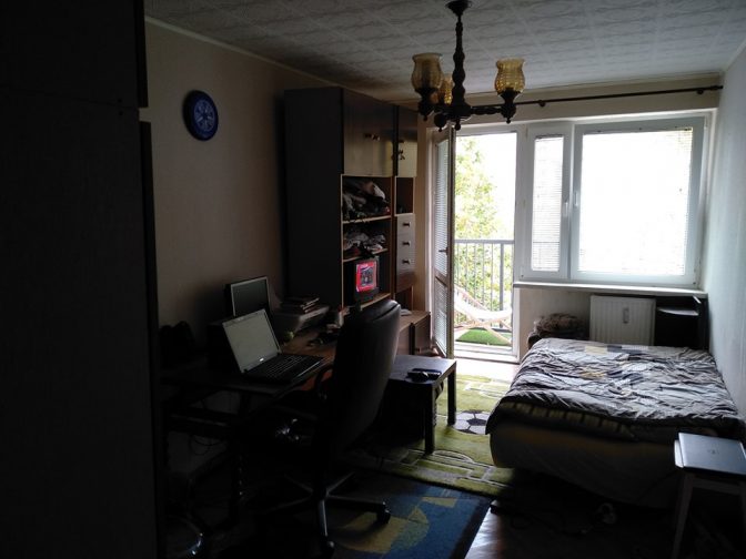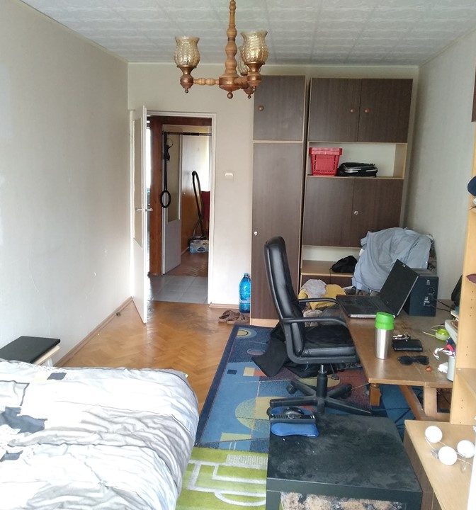 Pokój ma 15 m kw. i posiada balkon. W pokoju rozkładana kanapa (łóżko, mega wygodne ), duża szafa, barek, druga szafa z półkami, stół/biurko, stolik, narożna szafka nocna. Okna i balkon na stronę zachodnią.