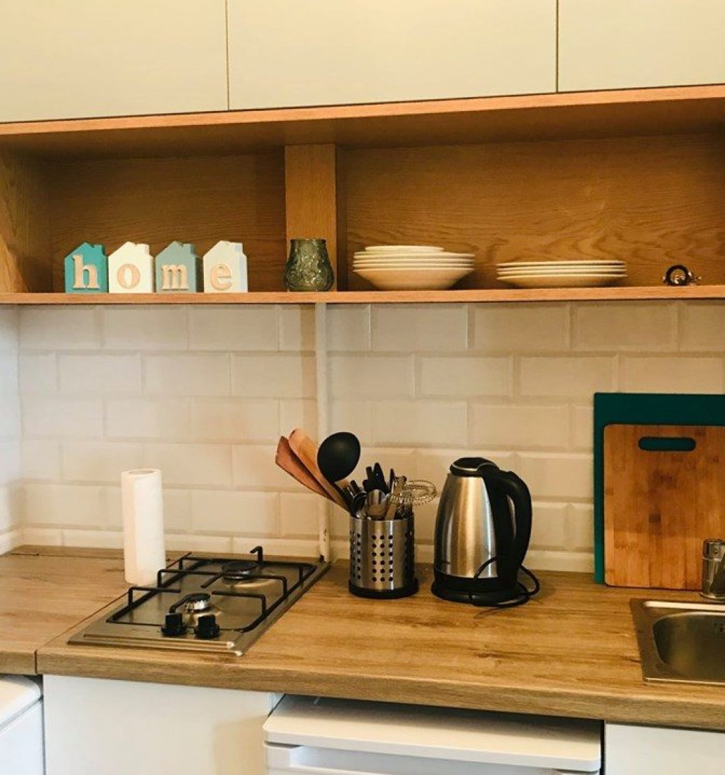 Aneks kuchenny wyposażony jest w kuchenkę gazową, pralkę oraz lodówkę. W szafkach do dyspozycji najemcy są wszystkie potrzebne przybory kuchenne.