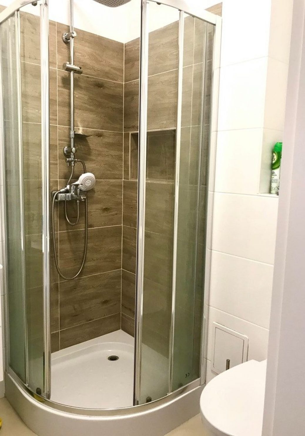 Łazienka wyposażona jest w prysznic, toaletę oraz umywalkę z szafką.