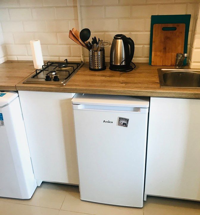 Aneks kuchenny wyposażony jest w kuchenkę gazową, pralkę oraz lodówkę. W szafkach do dyspozycji najemcy są wszystkie potrzebne przybory kuchenne.