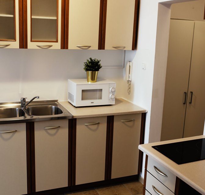 Kuchnia wyposażona w meble i sprzęt AGD oraz osprzęt kuchenny typu garnki, patelnia, talerze itp.,wszystko czego potrzebujesz .