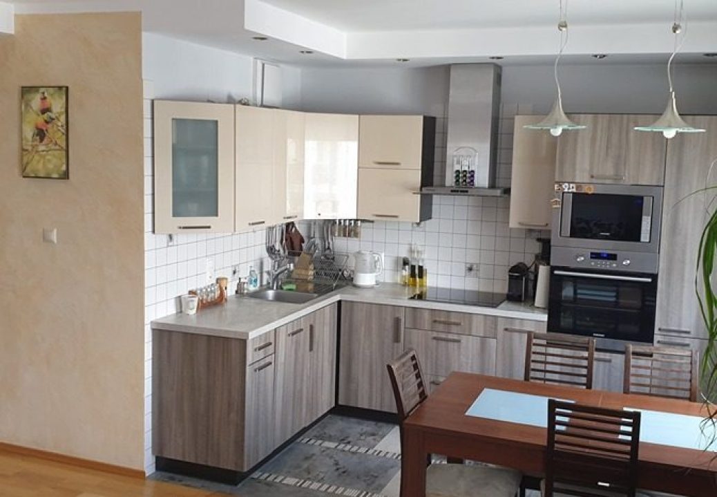Do wynajęcia 53 m2 mieszkanie zlokalizowane przy ul. Terespolskiej – Praga Południe. Mieszkanie składa się z otwartego, przestronnego salonu (rozkładana kanapa, stolik kawowy, komoda, telewizor) połączonego z kuchnią (na wyposażeniu m.in. płyta indukcyjna, zmywarka, piekarnik, mikrofalówka, stół z krzesłami), oddzielnie duża sypialnia z balkonem (w niej rozkładane, dwuosobowe łóżko oraz duża szafa). Otwarty korytarz, w nim szafa wnękowa i szafka na buty. Do mieszkania przynależy miejsce postojowe w garażu podziemnym (opcja dodatkowa).