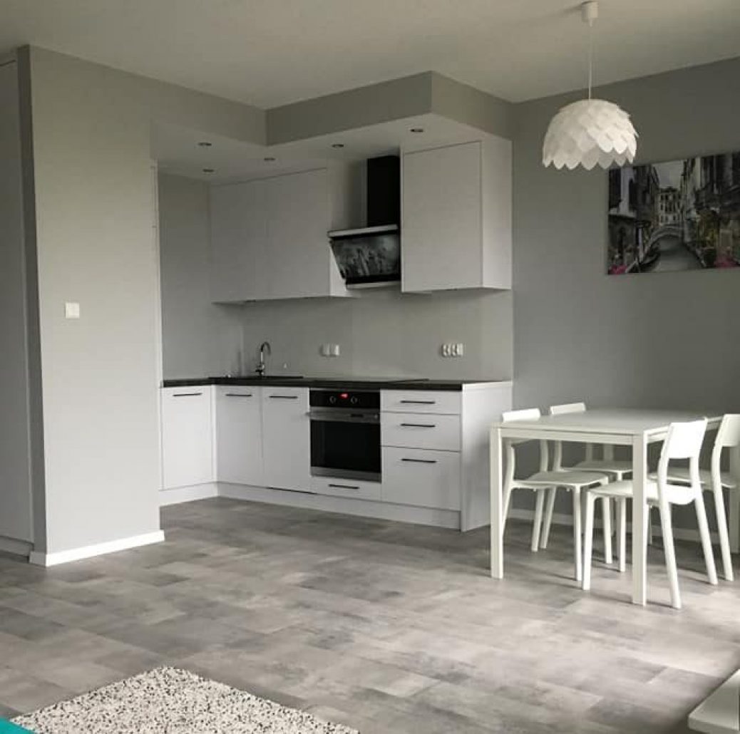 Kuchnia wyposażona jest w niezbędne sprzęty ADG ( zmywarka, piekarnik, lodówka, kuchnia indukcyjna, okap)