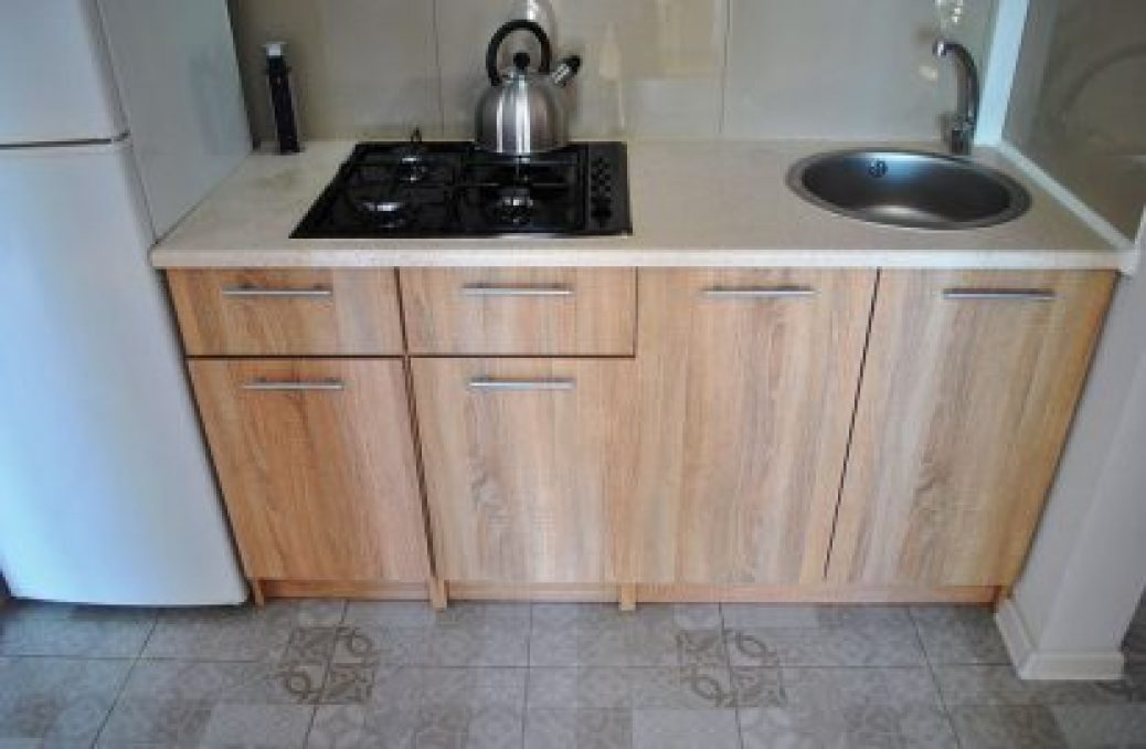 Korytarz z aneksem kuchennym – płyta gazowa, mikrofalówka, czajnik, duża lodówka z zamrażalnikiem, talerze, sztućce, garnki, odkurzacz, pralka.