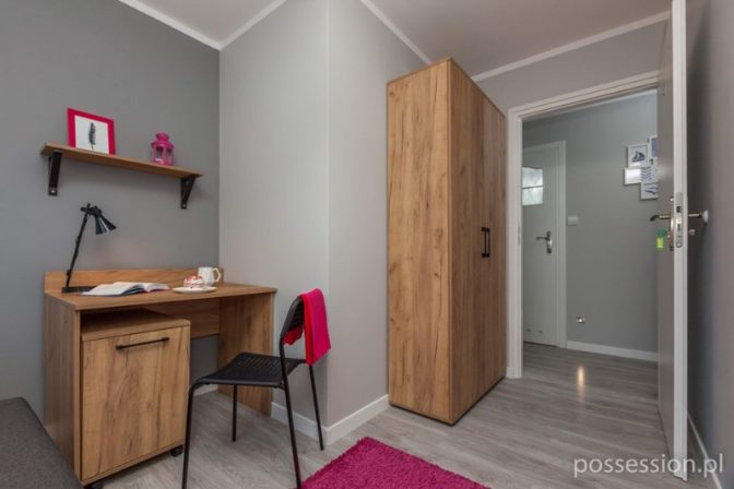Obiekt oddany w sierpniu 2018 roku, pozwala cieszyć się nowym wyposażeniem i wysokim standardem jak na przykład instalacja TV na wysokości oczu co ułatwia wykorzystanie jej jako monitor, pralkosuszarka w łazience czy szybkie połączenie internetowe WiFi. Nowoczesny wystrój wnętrza o który zadbał projektant sprawi, że poczujesz się jak u siebie. Nasz pokój został wyposażony w rozkładaną sofę, szafę oraz miejsce do nauki/pracy. Do dyspozycji lokatorów przestronna kuchnia z pełnym wyposażeniem oraz przyjemna łazienka z prysznicem niskoprogowym. Kaucja to tylko jednomiesięczny czynsz z opłatami.