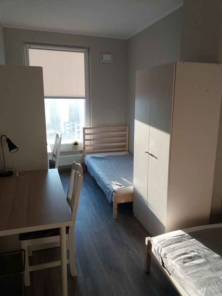 -każdy pokój wyposażony w łóżko z materacem 90cm; biurko z lampką; szafę z wiszącymi półkami na ubrania.