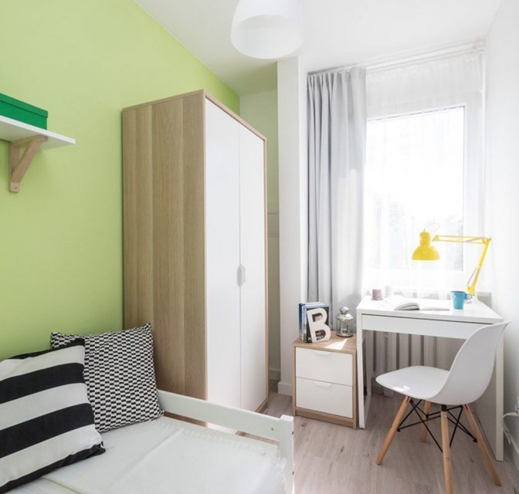 Pokój, który Ci proponuję jest oddzielny, zamykany na klucz. Wyposażony w nowe meble (łóżko z wygodnym sprężynowym materacem, duża szafa na ubrania, komoda, regał na książki, biurko z krzesłem oraz suszarkę na pranie).