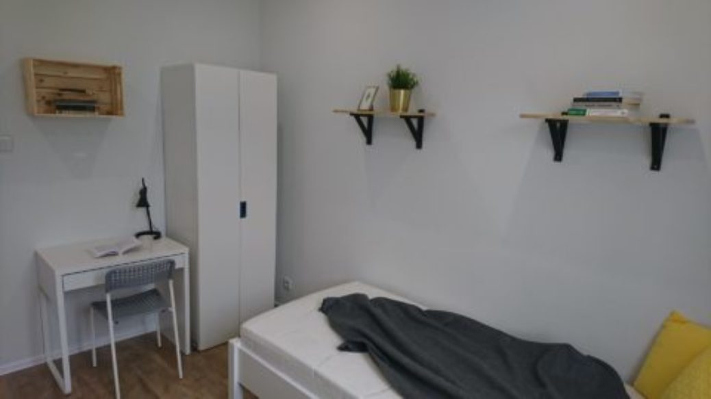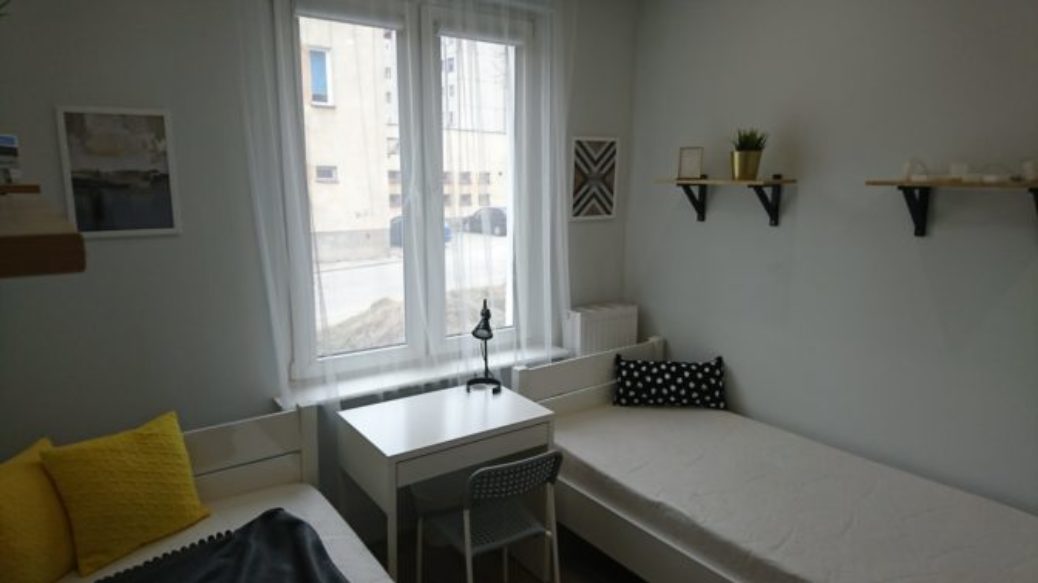 Pokój jest kompletnie wyposażony i zamykany na klucz. Do dyspozycji jest m.in. kanapa, szafa, komoda, biurko. Całe niezbędne wyposażenie. W pokoju dwa pojedyncze łóżka widoczne na zdjęciu zostały wymienione na podwójną kanapę i pokój może zostać wynajęty parze lub jako spora jedynka.