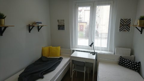Pokój jest kompletnie wyposażony i zamykany na klucz. Do dyspozycji jest m.in. kanapa, szafa, komoda, biurko. Całe niezbędne wyposażenie. W pokoju dwa pojedyncze łóżka widoczne na zdjęciu zostały wymienione na podwójną kanapę i pokój może zostać wynajęty parze lub jako spora jedynka.