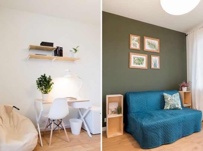 mini-lodówka,pojemna szafa, wygodna kanapa / łóżko, biurko oraz krzesło. Do tego lampka, pled, poduszki, suszarka do bielizny.