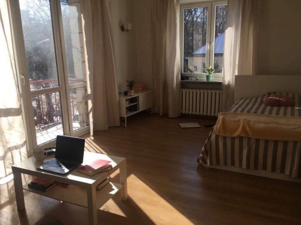 Cichy blok/kamienica z wyższym sufitem, dużymi oknami i balkonem.