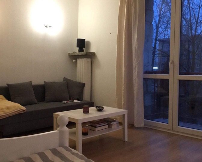 Cichy blok/kamienica z wyższym sufitem, dużymi oknami i balkonem.