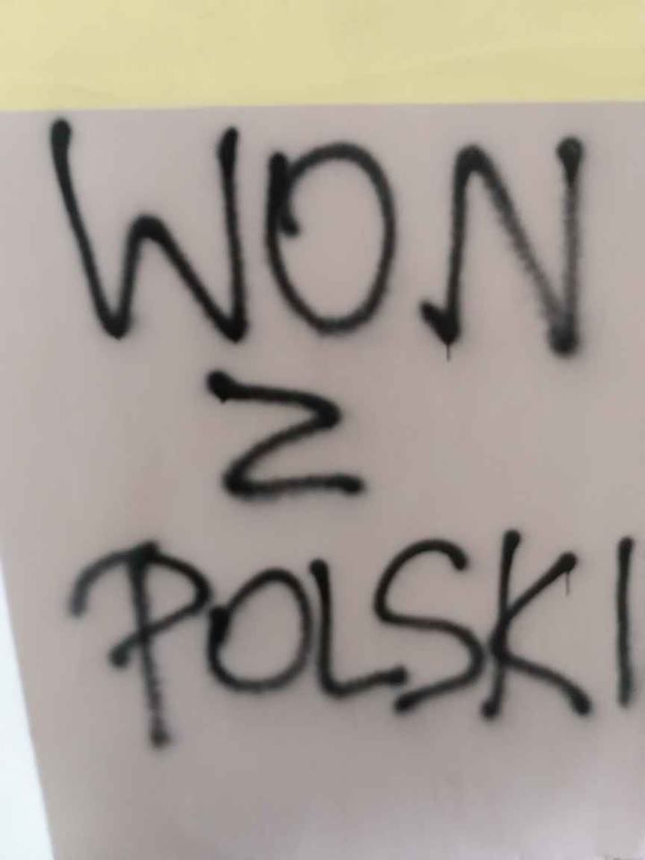 Вночі з п’ятниці на суботу у квартиру українців, які будують Варшавське метро, була кинута пляшка із запалювальною сумішшю, а стіни сходової клітки брутально обписані. Про це на своїй сторінці у Фейсбук повідомив Центр моніторингу расистської та ксенофобської поведінки. Власне до цієї організації з листом звернулися постраждалі: