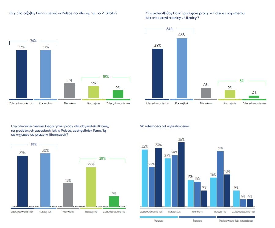 Загальна картина міграції до Польщі має багато аспектів, але безумовно варто звернути увагу на те, що 79% опитаних висловили задоволення від умов праці в Польщі, також 85% дали позитивну оцінку співпраці з польськими колегами на робочому місці. Такі настрої позначилися й на тому, що 3/4 опитаних висловили бажання залишитися в Польщі на 2-3 роки. Польських експертів має тішити така статистика, та як наголошує пан Вітуцькі, треба брати до уваги й інші аспекти. Зокрема той, що 2/3 мігрантів з України працює на нижчих від своєї кваліфікації посадах, що здебільшого стосується осіб із вищою освітою. Тобто при сучасній моделі міграції на польський ринок праці, не в повній мірі використовується потенціал працівників. А тим часом, у країні щораз більший кадровий дефіцит, зокрема й кваліфікованих працівників.