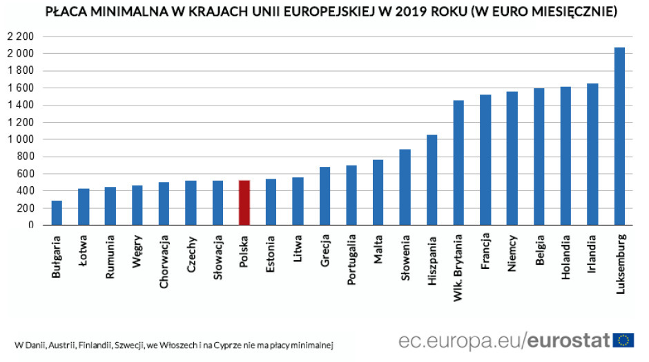 Як подає європейське управління статистики, найвища мінімальна зарплата в ЄС встановлена в Люксембургу і складає понад 2 тисячі євро. Звісно на її фоні Польща виглядає, делікатно висловлюючись, не найкраще. Водночас, правда полягає в тому, що з найменшою країною Бенілюксу жодна інша країна ЄС не може рівнятися. Друга в цьому списку Ірландія і треті Нідерланди спроможні виплачувати мінімалку на 400 євро меншу.