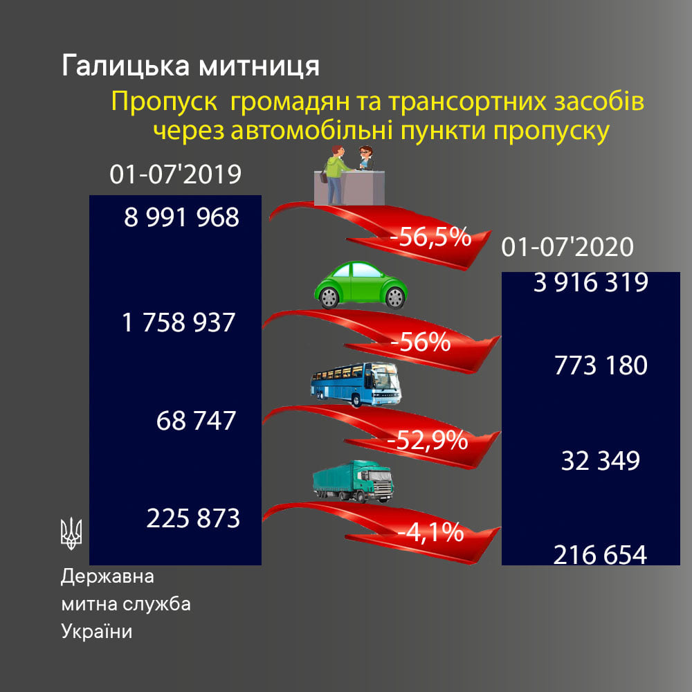На половину зменшився пасажирський рух через автомобільні пункти пропуску за рік часу. Про це інфографікою на своїй сторінці у Фейсбук повідомляє Галицька Митниця. На стільки ж скоротилося оформлення легкових автомобілів і пасажирських автобусів. Лише автомобільні вантажні перевезення через кордон майже не зазнали змін.