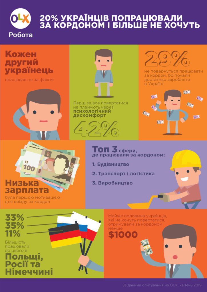 Кожний другий українець, який виїхав на заробітки за кордон, а потім не захотів повертатися, працював не за своєю спеціальністю. Майже чверть незадоволених респондентів пропрацювали за кордоном у будівельній сфері. Друга за популярністю галузь – логістична, переважно це робота водієм – 17%. Топ-3 закриває виробництво – 15%.