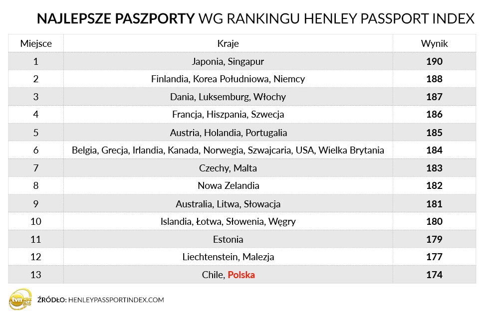 Японці та сингапурці можуть без візи або з візою придбаною вже на місці в’їхати до 190 країн світу. Це найпотужніші паспорти світу — принаймні так твердить tvn24.pl з посиланням на останній рейтинг опублікований фірмою Henley&Partners. Польща в цьому переліку опинилася на 13 сходинці. Власники польського паспорта можуть без проблем в’їхати до 174 країн світу. Це як пише видання на 17 країн більше ніж 5 років тому. Що ж стосується України, то паспорт із тризубом поділив у цьому рейтингу 43 сходинку з власниками колумбійського документа для закордонних поїздок. Громадяни України можуть без проблем навідатися до 126 країн світу. Щоправда, варто нагадати, що Україна провадить активну роботу в цьому напрямку й доволі часто можна почути про нові країни доступні для українців у безвізовому режимі.
