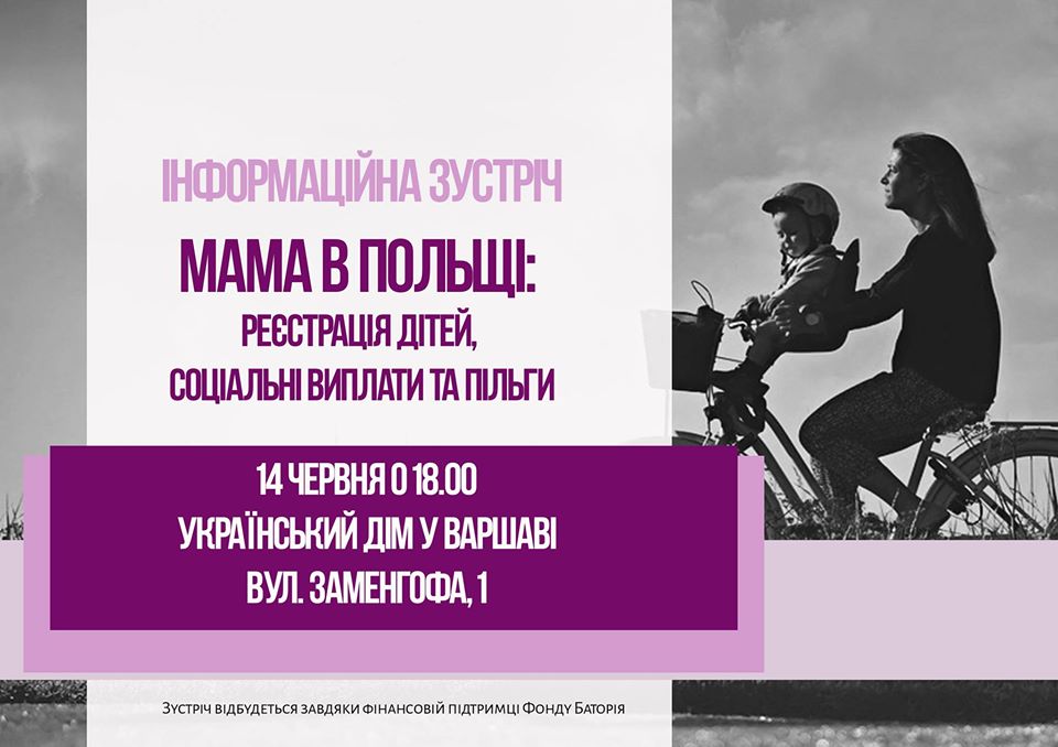 «Запрошуємо вас 14 червня о 18:00 до Українського дому (Заменхофа 1) на інформаційну зустріч «Мама в Польщі»: реєстрація дітей, соціальні виплати та пільги», – зазначається у повідомленні на сторінці події у Facebook.