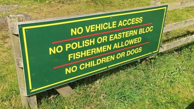Польський іммігрант у Великій Британії хоче подати до суду на власника рибальського господарства за антипольський та дискримінаційний напис. Таблиця з написом: «В’їзд автівкою заборонений. Вхід рибалкам з Польщі та східного блоку заборонений (…)» встановлена на терені рибальського господарства у графстві Оксфордшир. Як повідомляє Польське радіо, іммігрант надав справі розголосу. Він звинувачує власника у дискримінації.