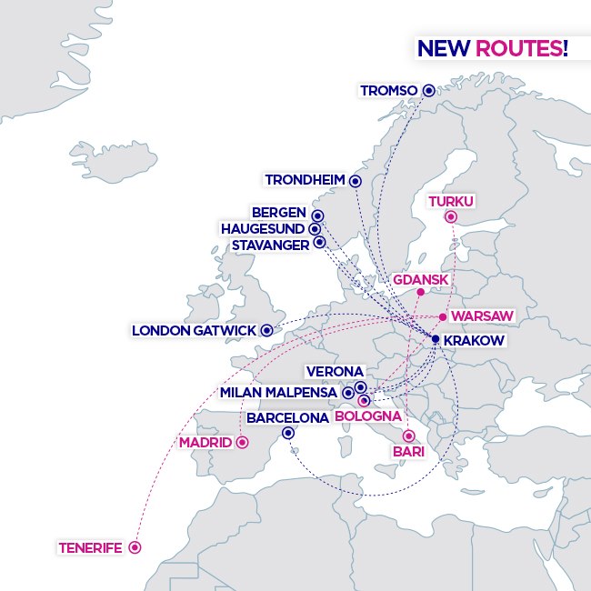 Зокрема, угорський лоукостер буде виконувати перельоти з Варшави на Тенеріфе (Іспанія), в Болонью (Італія), Мадрид (Іспанія) і Турку (Фінляндія). Із Кракова – в Тронхейм, Берген, Ставангер, Гаугесун, Тромсе (Норвегія), Верону, Мілан-Мальпенса, Болонью (Італія), Барселону (Іспанія), Лондон-Гатвік (Велика Британія). З Гданська – в Барі.