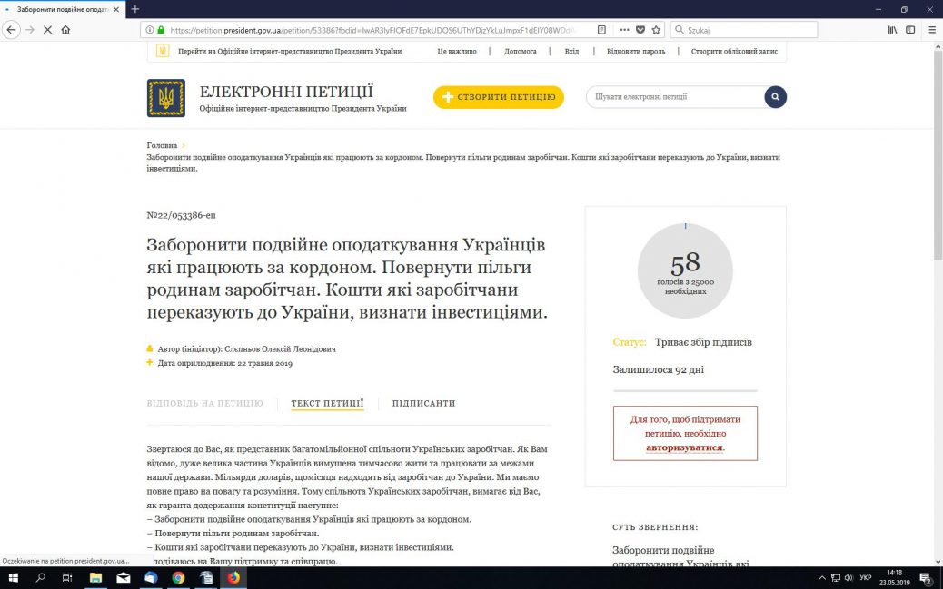 На офіційному інтернет-представництві Президента України в середу 22 травня з’явилася електронна петиція за номером №22/053386-еп. Автором звернення до гаранта став Слєпньов Олексій Леонідович. Серед іншого він просить заборонити подвійне оподаткування Українців які працюють за кордоном, повернути пільги родинам заробітчан, а кошти які заробітчани переказують до України, визнати інвестиціями.