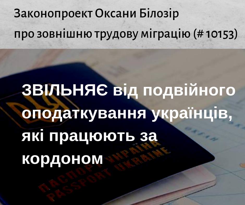 “Цей законопроект звільняє раз і назавжди українців, котрі працюють за кордоном від ПОДВІЙНОГО ОПОДАТКУВАННЯ!!!” – саме таке пояснення своєї та ще групи депутатів авторів законопроекту № 10153 ініціативи умістила на своїй сторінці в мережі Facebook нардеп Оксана Білозір. Про ініціативу нардепів створити фактично нове міністерство, фонд підтримки, до якого мали б мігранти робити добровільні внески ми нещодавно писали.